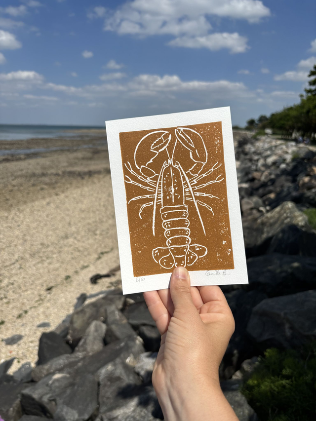 Impression utilisant la technique de linogravure réalisée artisanalement dans mon atelier basé à La Rochelle.