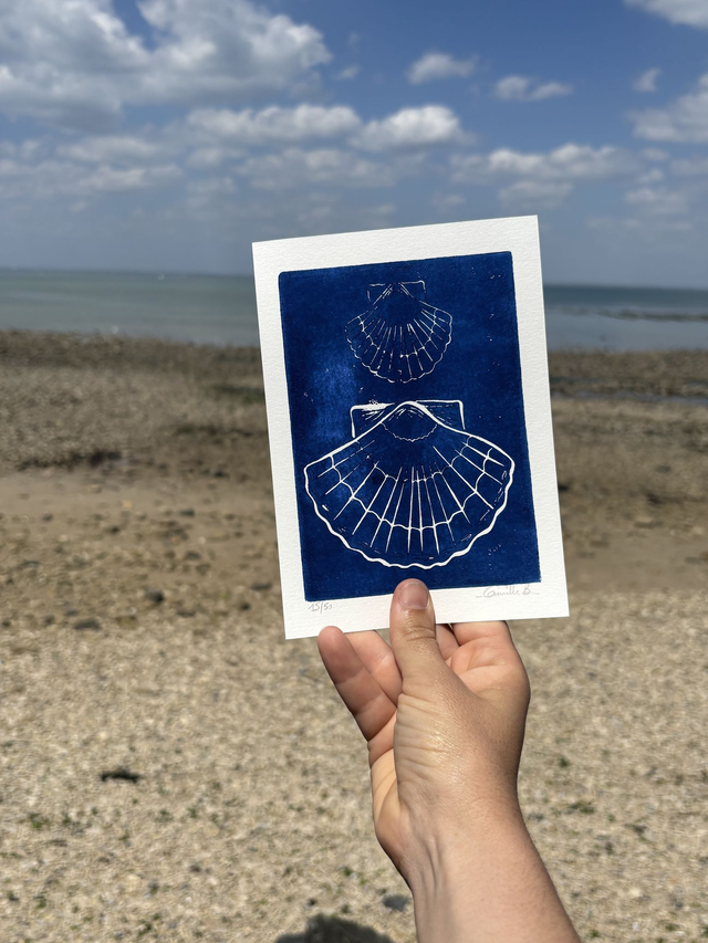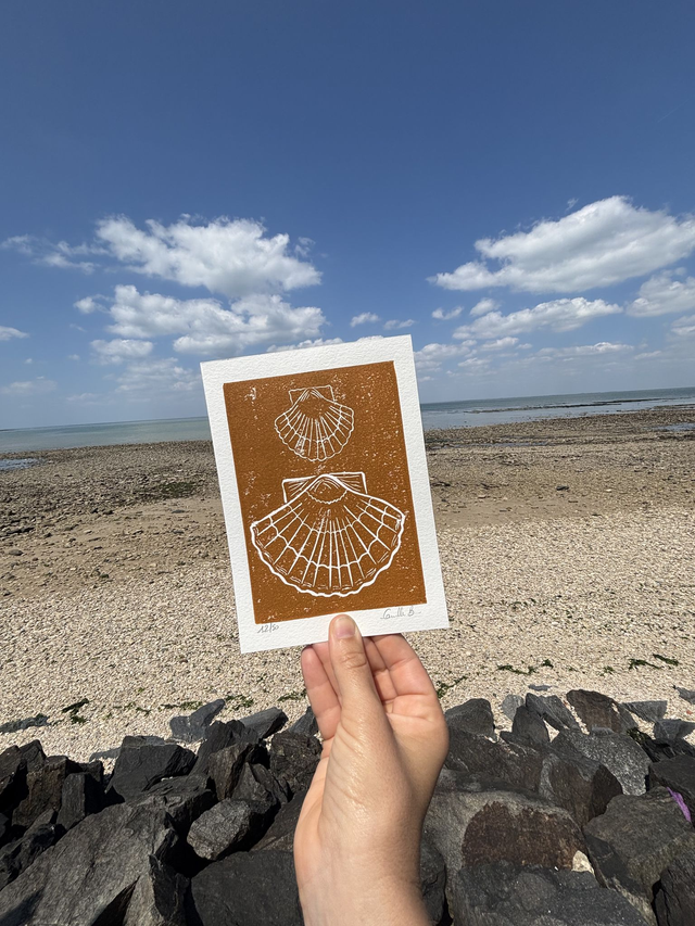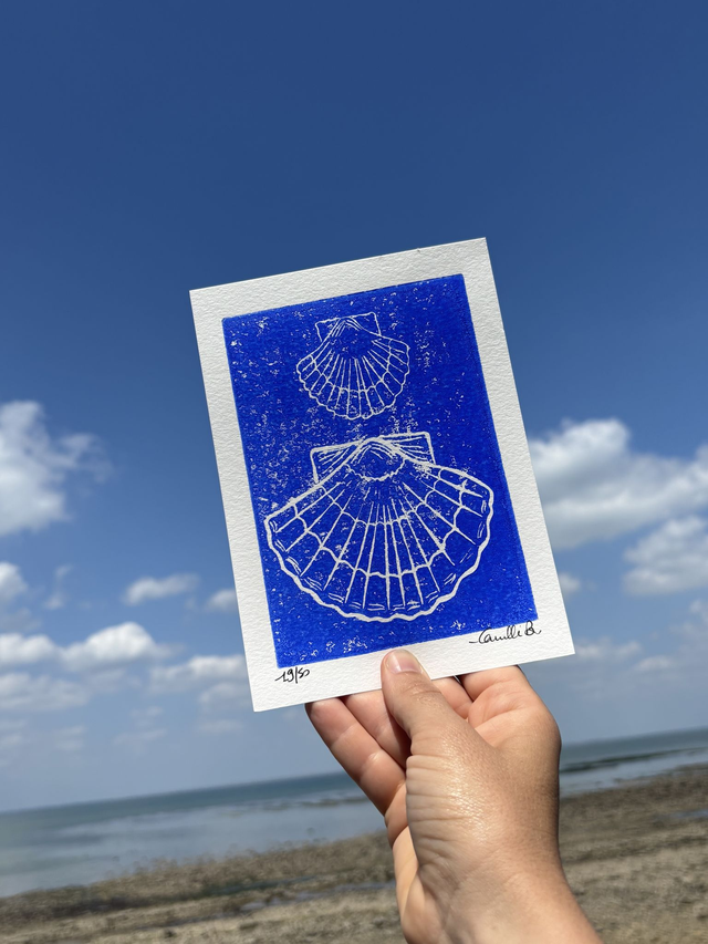 Chaque linogravure est emballée soigneusement, puis glissée dans une pochette cartonnée rigide recyclée afin de protéger le tirage pendant le transport. Elle est envoyée en lettre suivie.