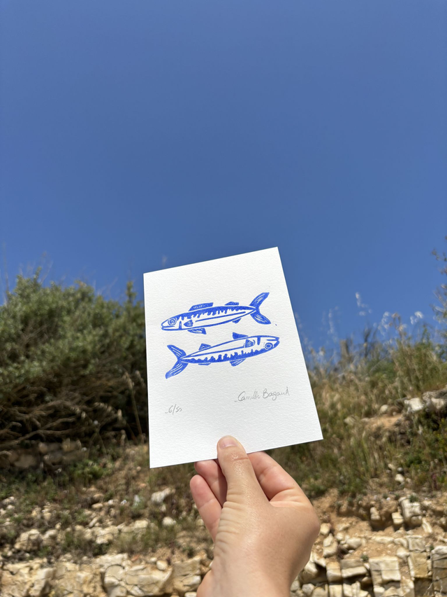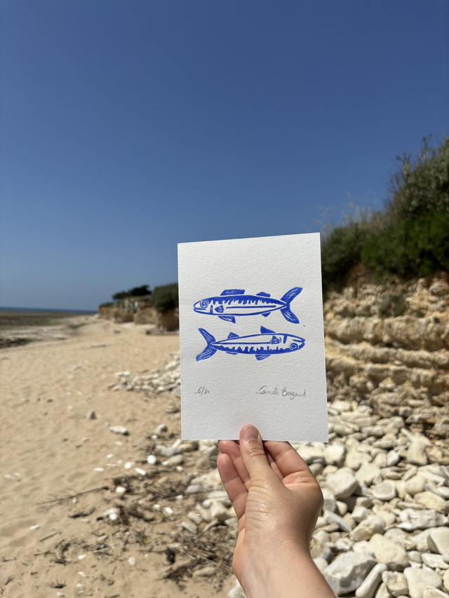 Chaque linogravure est emballée soigneusement, puis glissée dans une pochette cartonnée rigide recyclée afin de protéger le tirage pendant le transport. Elle est envoyée en lettre suivie.