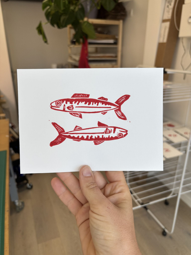 Impression utilisant la technique de linogravure réalisée artisanalement dans mon atelier basé à La Rochelle.